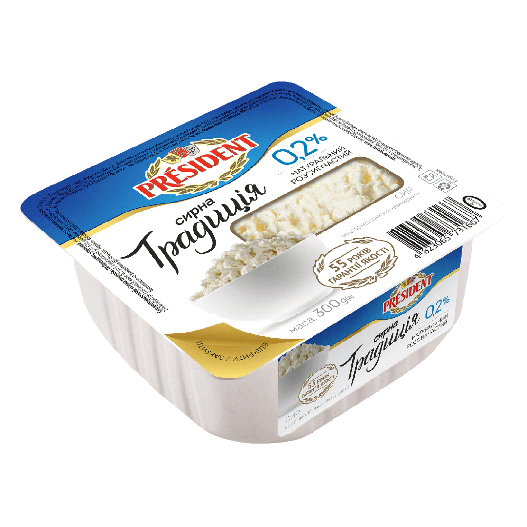 Соковитий і розсипчастий сир від ТМ Президент виготовляється зі свіжих інгредієнтів та має ніжні, великі зерна. Завдяки збалансованому смаку відмінно підходить для споживання як самостійний продукт та для приготування улюблених страв та кулінарних шедеврів.