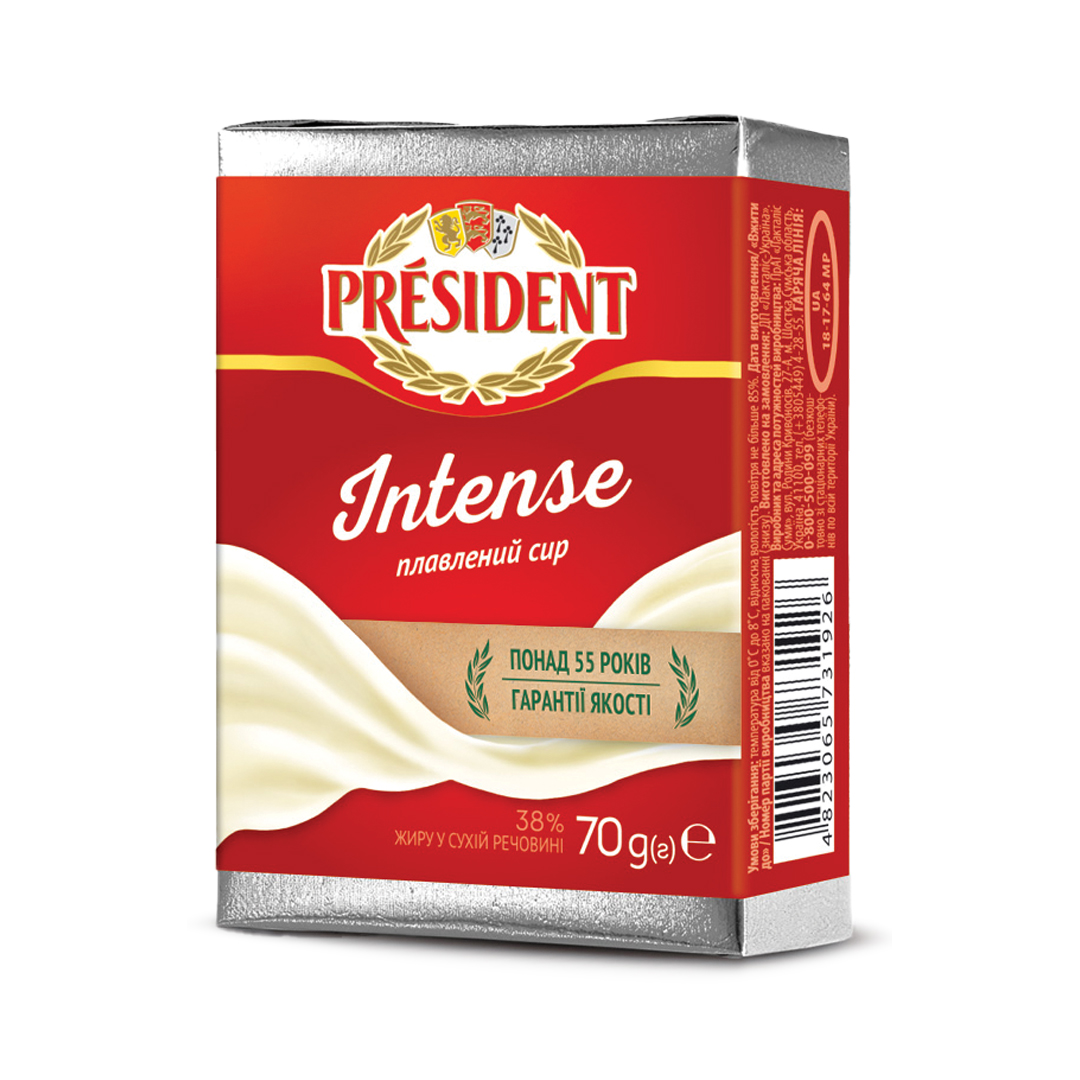 Плавлений сир Президент Intense з яскраво вираженим, насиченим смаком має ніжну текстуру з гострими нотками ароматного сиру.